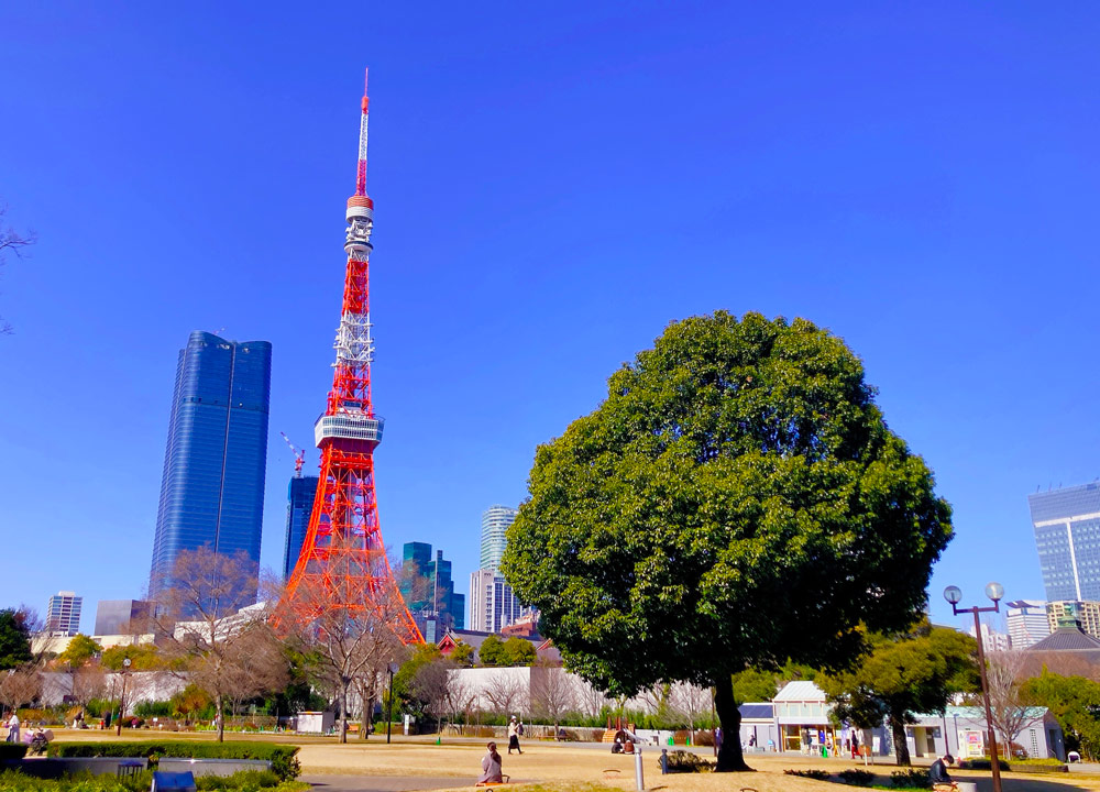 近くの芝公園からは東京タワーが目の前にそびえたつ絶景が拝める。今はスカイツリーが日本一を誇る高さだけれど、東京タワーの象徴的なこの姿も捨てがたい。