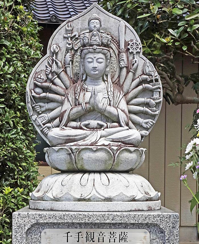十一面観音にさらに千個の手(無限の手)が増え、より多くの人々を救うことが出来る。また、手には目がついており、より多くの物事が見通せるようになった。よって、千手千眼観音せんじゅせんがんかんのんとも呼ばれている。