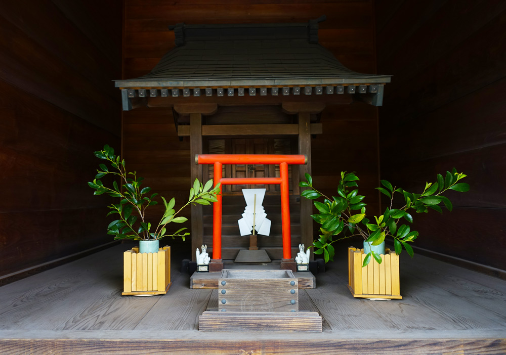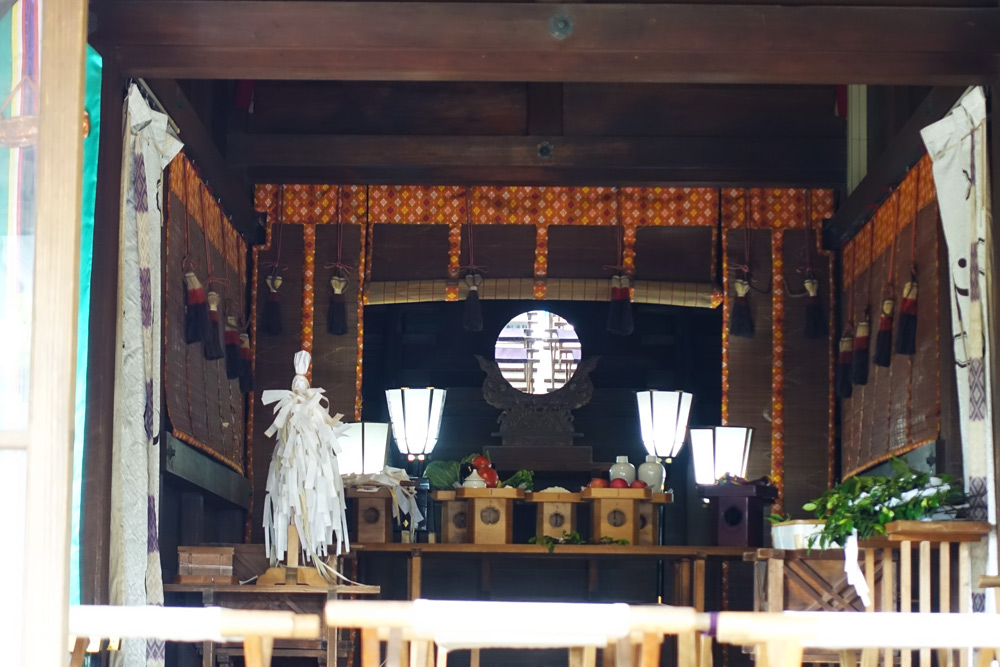 まずは御神体として置かれている鏡が目に飛び込んでくる。この鏡は主に天照大御神を祀る神社でよく見られるものだそう。鏡は太陽を象徴しており、また、岩戸の神話においてもアマテラスが鏡を利用したことから、鏡が御神体として祀られる理由となっている。