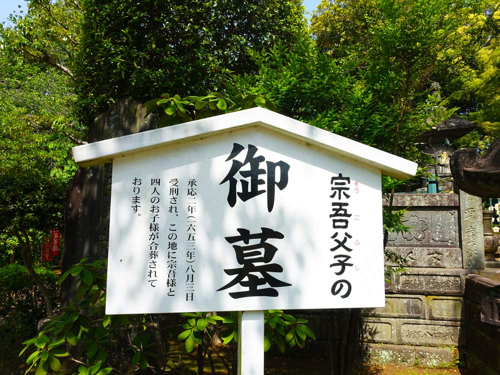 直訴をしたことで、佐倉藩の家老に咎められ、惣五郎夫妻は磔となり、男子4人も死罪となった場所がこの地であり、お墓が建てられた。現在の境内は昔の処刑場でもあった。