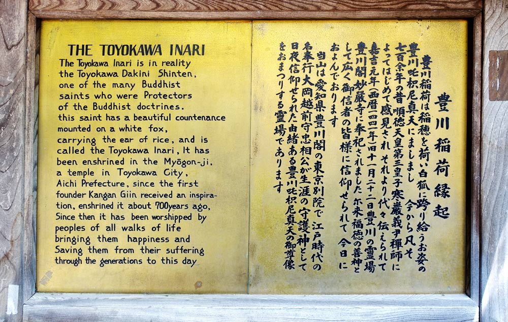 豊川稲荷は、稲穂を荷い白い狐に跨る姿の豊川吒枳尼真天とよかわだきにしんてんであったとされ、妙厳寺に奉祀ほうししたとある。