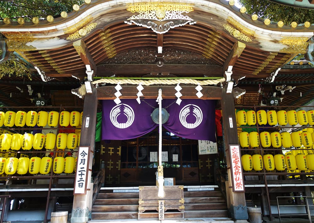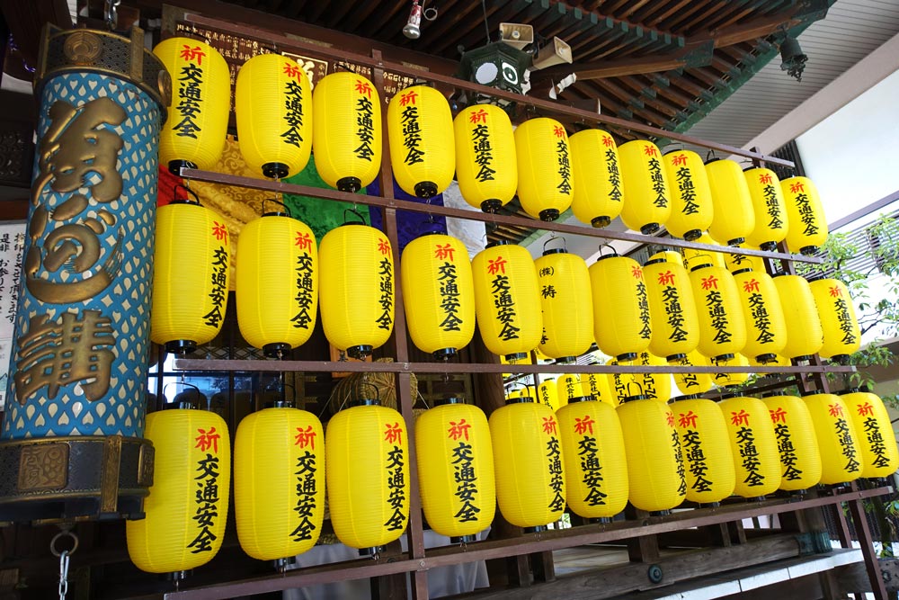 本堂にずらりと並ぶ提灯を間近で見てみると、交通安全祈願のようだ。そういえば、この神社の前を走る道路は、交通量が多い道路だった。