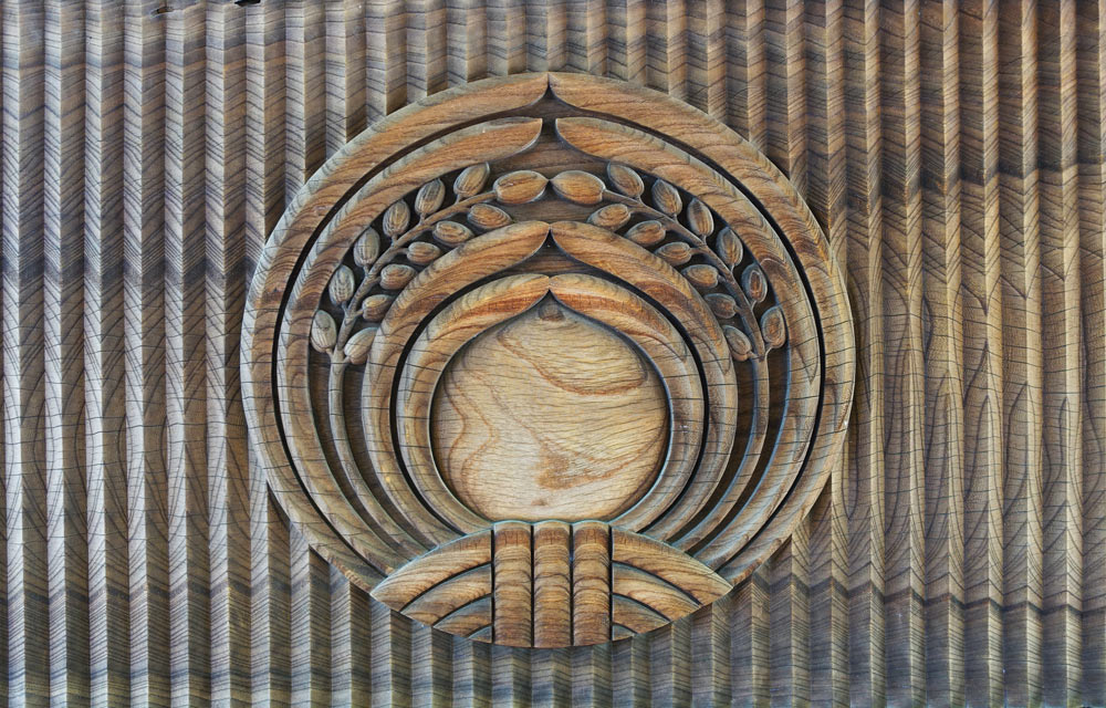 柱に施されたつる草のような模様がきれいな緑色で塗られており、この色の取り合わせも、なんだかモダンで美しい。