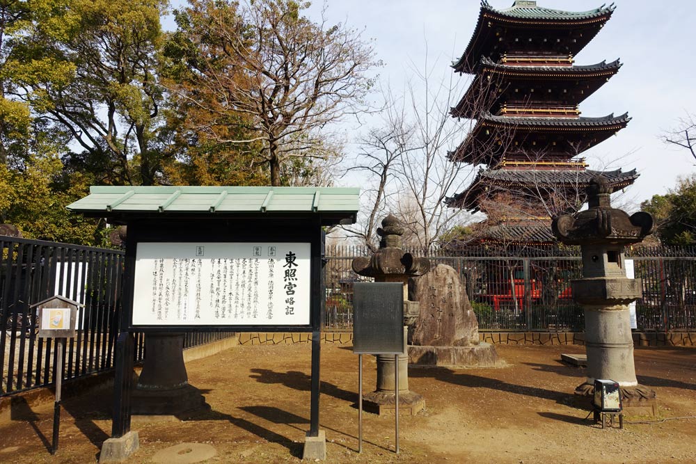 実はこの五重塔、元々東照宮所属だったものが、明治の神仏分離令を受けて寛永寺の所属となった。しかし寛永寺は上野戦争で焼失、その敷地の多くを公園用地として没収されてしまった。これにより、上野東照宮から離れた地で再建されたのだそう。現在は東照宮の参道に面している。