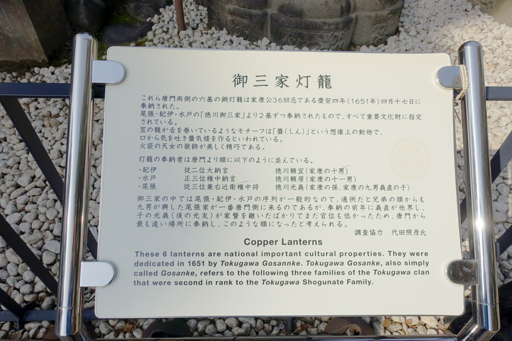 これら唐門両側の六基の銅灯籠は家康公36回忌である慶安四年(1651年)四月十七日に奉納された。
