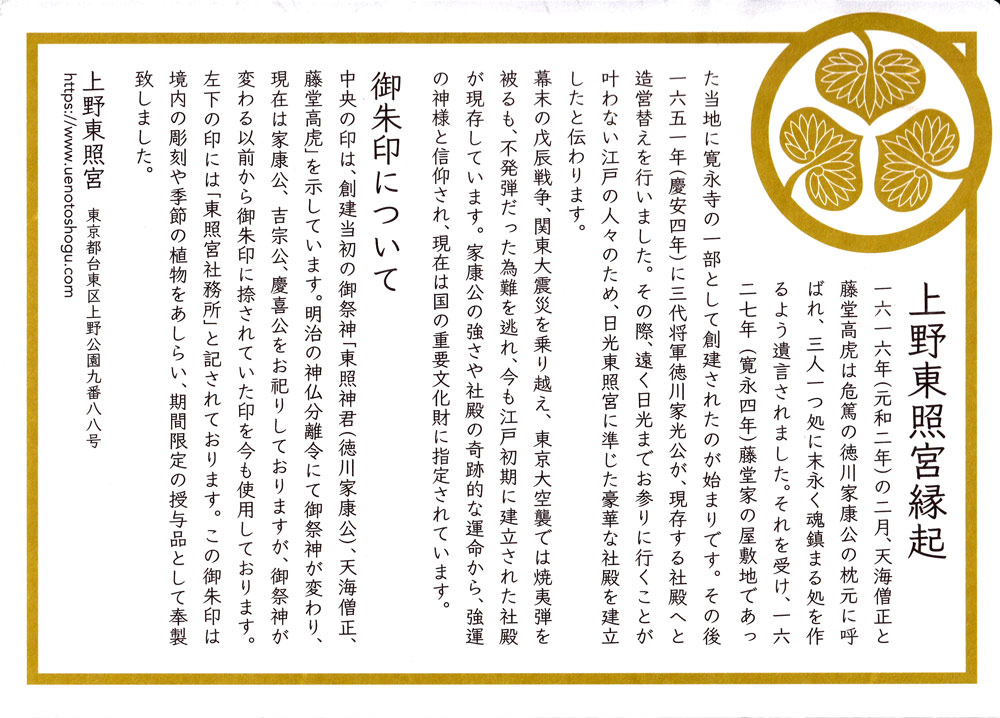上野東照宮の御朱印|江戸初期に建立された当時の社殿は華やかで荘厳な造りであった(東京都上野)
