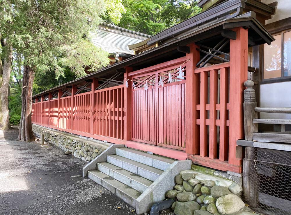 この朱塗りの柵の向こうに、本殿の屋根が見える。